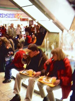 Viel zu klein angelegte Sitzmöglichkeiten der Gastronomie.Die Leute müssen ihr Essen auf den Knien halten und auf dem Brunnenrand sitzen.Wenn man an Gaststätten vermietet muß man darauf schauen ob